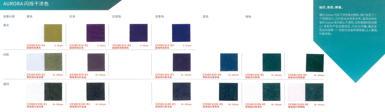 本产品采用合成云母基底,表面结构高度光滑规整,赋予其优异的光学性能。与CosPearl系列相比,其色彩表现更为纯净、鲜艳且闪耀,提供丰富色系选择:包括经典银白、干涉色、金色、金属色,以及高饱和度的黄、橙、粉、紫、蓝、绿、黑等强烈色彩,同时支持定制填料。产品具有高透明度与卓越的反射率,色度饱满且稳定(多数Aurora系列珠光颜料呈现纯白粉末基底,确保色彩还原度)。粒径覆盖小、中、粗多规格,可灵活适配不同妆效需求,广泛适用于化妆品及个人护理产品的开发,尤其适合追求高显色度与光泽感的配方设计。